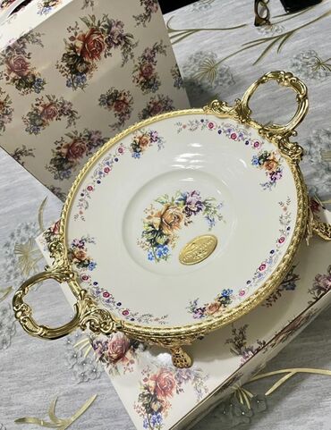 - Material: porselen kasa və boşqablar, qızılı rəngli metal karkas, dəstək və ayaqlar