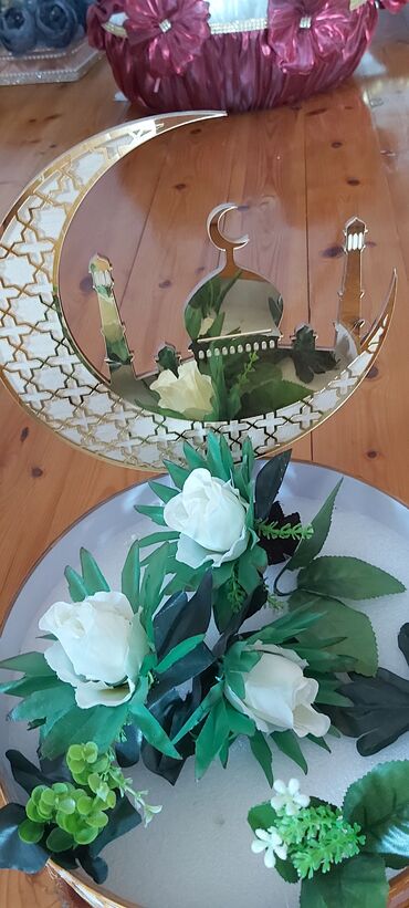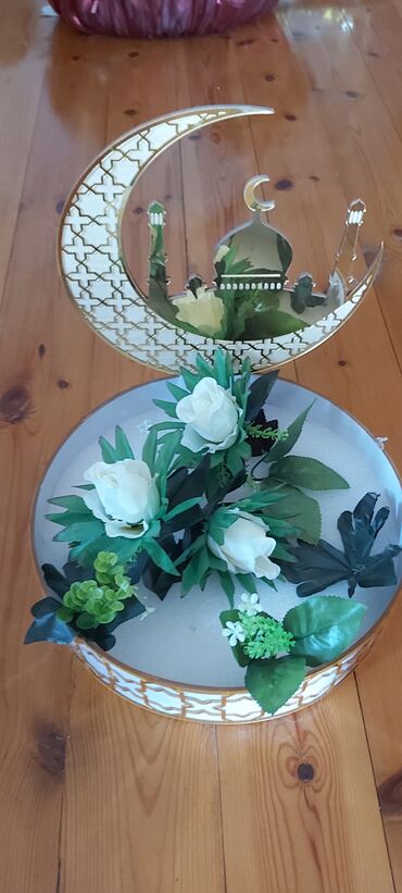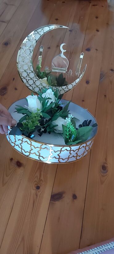 Ramazan Bayramı və ya digər islami bayramlar üçün nəzərdə tutulmuş bir dekorativ qabı əks etdirir. Qab ağ rəngdədir və üzərində qızılı rəngli həndəsi naxışlar var. İçərisində ağ rəngli qızılgüllər və yaşıl yarpaqlar olan süni çiçək dəstəsi yerləşdirilib. Qabın arxa hissəsində aypara və məscid silueti formasında qızılı rəngli metal bəzək var. Bu dekorativ qab bayram süfrəsi üçün ideal bəzək elementi ola bilər.