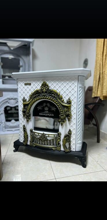 Qaz sobası – klassik dizaynlı dekorativ kamın görünüşündə - Brend nümunələri: Mahshid Gas, Behkaran (şüşə panel üzərində loqolar görünür) - Yanacaq: təbii qaz/ballon qazı üçün uyğun quruluş (qaz s...