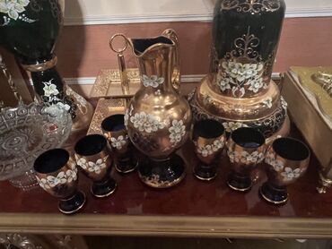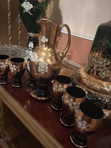 Böyük dekorativ qrafin və stəkan dəsti - Material: qalın şüşə/bohem tipli şüşə - Rənglər: tünd kobalt-mavi və metalik qızılı tonlar - Bəzək: əl işi kimi görünən həcmli çiçək ornamentləri, ağ-yaşıl...