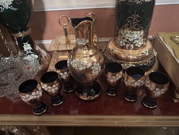 Şüşə qrafin və altı ədəd uyğun stəkandan ibarət dəst. Dəst qəhvəyi və qızılı çalarlarda, üzərində qızılı rəngdə çiçək və yarpaq naxışları ilə bəzədilmişdir. Qrafinin və stəkanların üst hissəsi qızı...