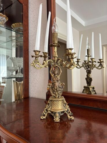 - Şamdanlar: hər birində 5 şam yuvası + mərkəzdə dekorativ alov formalı başlıq; uzun konus tipli şamlarla uyğun