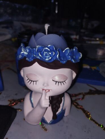 - Rəsmli fiqur formasında şam: gözləri bağlı qız heykəlciyi, saç çiçək tacı və üst hissədə inteqrə olunmuş şam fitili ilə.