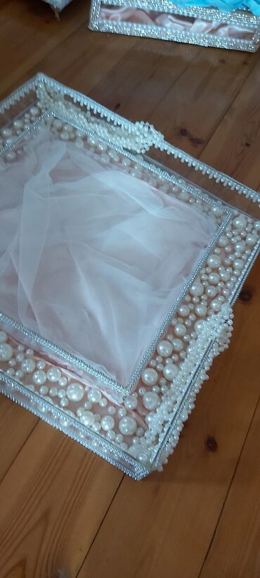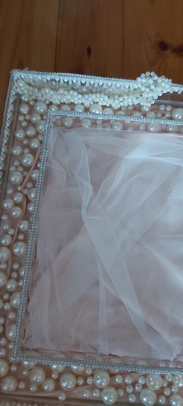 Toy ve Nişan xoncasi. Bu, müxtəlif əşyaları saxlamaq ve eşyalar yiqmaq üçün istifadə olunan dekorativ qutudur. Şeffaf rəngdədir və inci bəzəklər və mirvari detallı toxunmuş xoncadir Qutunun kənarları mirvari ile bezedilib, bu da ona zərif görünüş verir. Bu qutu evdə dekorativ element kimi istifadə edilə bilər və ya hədiyyə qutusu kimi də uyğundur. Daxili hissəsi ipək materialla örtülmüşdür. Bu qutu, zinət əşyaları, kiçik xatirələr və ya digər dəyərli əşyalar üçün ideal saxlama yeri təklif edir. Qutunun səthi hamar və parlaq materialdan hazırlanıb, alt hissəsi isə şeffaf dizayna malikdir. Müxtəlif məqsədlər üçün istifadə oluna bilər.