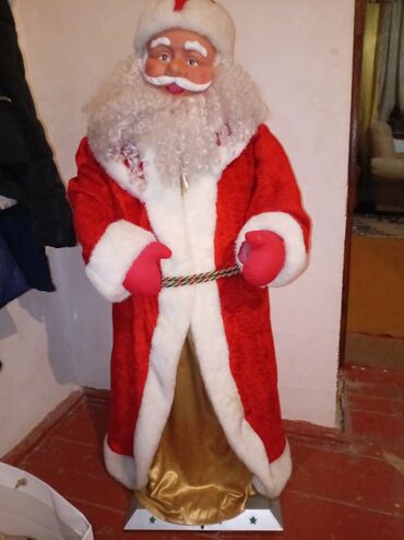 Məhsul: Dekorativ Şaxta Baba fiquru - Böyük ölçülü, yerə qoyulan dekor fiqur - Qırmızı-adi Şaxta Baba geyimi: uzun qırmızı papaq, qırmızı şalvar, krem-ağ xəz kənarlı pencək və ağ xəz çəkmələr - Üz...