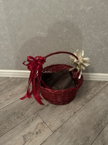 - Qırmızı rəngli hörmə səbət – yanlarda iri qırmızı və krem rəngli lent bəzəkləri, dairəvi forma.