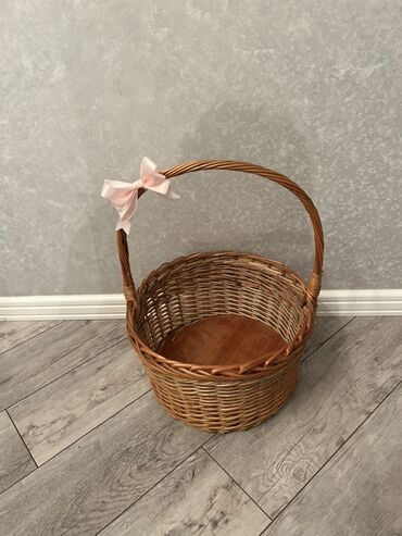 - Təbii rəngli klassik hörmə səbət – üst hissədə açıq çəhrayı lent bəzəyi, dairəvi forma, taxta diblik.