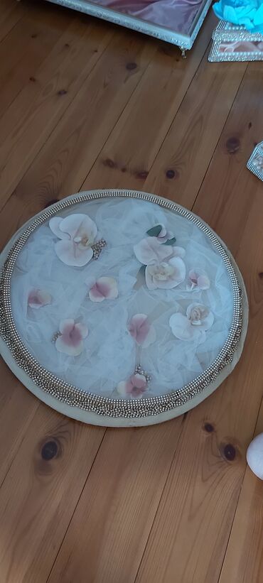 Pulsuz çatdırılmaTort qabi ve hediyye teqdim etmek ücün Zərif bəzəkli bu dekorativ xüsusi günləriniz, məsələn, nişan və ya toy mərasimləri üçün ideal seçimdir. Yumru formada hazırlanıb, kənarları qızılı rəngli muncuqlarla bəzədilib, bu da ona parlaq və cəlbedici görünüş verir. Qabin üst hissəsi şəffaf şüşe, icerisinde güller ve tül ilə örtülüb və üzərində açıq çəhrayı rəngli gül ləçəkləri ilə bəzədilib, bu da ona romantik və incə bir təsir bağışlayır. Bu qabi, bəyəndiyiniz əşyaları sərgiləmək və ya mərasimlərdə istifadə etmək üçün əla bir aksesuardır.