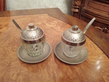- 2 ədəd şüşə-konfiter qapaqlı qab dəsti: preslənmiş şüşə kasa, metal (gümüşü rəng) qapaq və qaşıq, uyğun metal nimçə ilə komplekt.