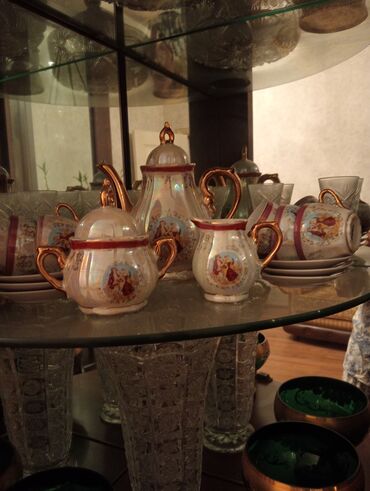 - Kobalt-mavi porselen kompozisiyası: mərkəzdə iri ayaqlı vaza/çanaq, ətrafında müxtəlif ölçülü şirniyyat qabları və qapaqlı kiçik badyalar. Qızılı naxışlar, relyef gül dekoru və miniatür medalyon təsvirləri ilə zənginləşdirilib.