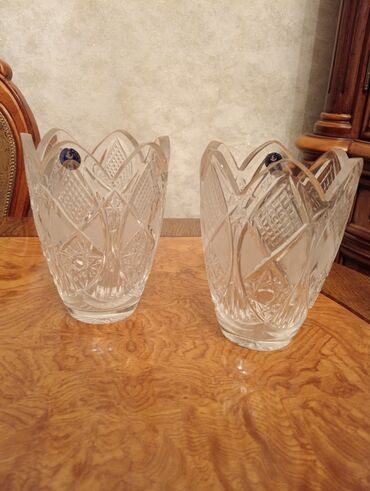 - 2 ədəd kəpənək kəsimli kristal vaz: qalın divarlı, çoxüzlü kəsim, klassik romb və zolaq ornamentləri, geniş boğazlı siluet – gül kompozisiyaları üçün ideal.