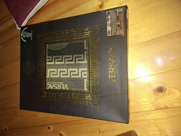 - Versace Home Collection motivli qara-qızılı paket/qutu: yunan açarı (meandr) ornamentli dizayn, suya davamlılıq işarəsi olan etiketlə. Parlaq qızılı detallı dekorativ masa örtüyü və/və ya tekstil məhsulu üçün təqdimat qutusu kimi.