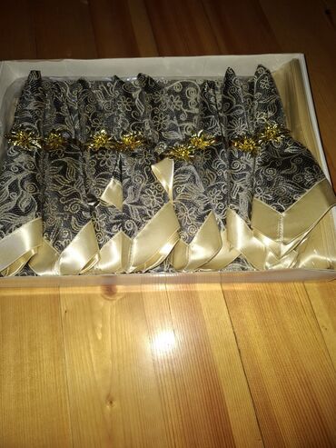 - Qutulu salfet dəsti: tünd boz-qızılı naxışlı parça salfetlər, krem-qızılı atlas kənar bəzəyi ilə. Hər salfet üçün metal qızılı rəngdə çiçək formalı salfet üzükləri var. Zərif təqdimatlar, ziyafət və bayram süfrələri üçün dekorativ görünüş verir.