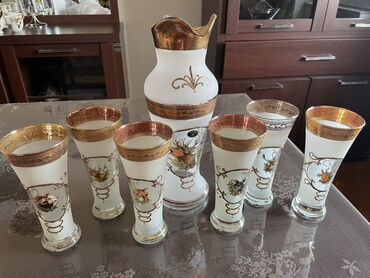 Böhm üslubunda dekorativ şüşə-servis dəsti - Material: rəngli büllur/şüşə və farfor - Dizayn: qızılı rənglərlə işlənmiş, əl naxışlı ağ çiçək bəzəkləri; zərif oyma və qızılı konturlar - Rəng palitr...