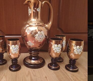 Böhm üslubunda dekorativ şüşə-servis dəsti - Material: rəngli büllur/şüşə və farfor - Dizayn: qızılı rənglərlə işlənmiş, əl naxışlı ağ çiçək bəzəkləri; zərif oyma və qızılı konturlar - Rəng palitr...