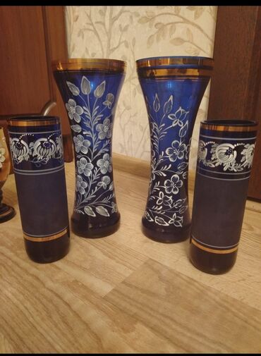 Kobalt mavi şüşədən dekorativ qab dəsti - Zərif qızılı naxışlar və əl işi çiçək motivləri ilə bəzədilmiş kobalt mavi şüşə - Dəst tərkibi: 1 ədəd vaza və 5 ədəd ayaqlı qab (ümumilikdə 6 hissə) - Qa...