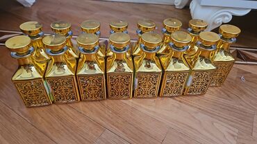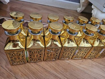 QızılıQızılı dekorativ şüşə flakonlar – zərif naxışlı, kvadrat formalı
