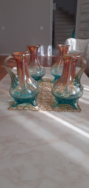 Məhsul: İrideks örtüklü dekorativ şüşə qablar dəsti. SSRİ dönəmindən qalıb! Hamısı birlikdə 20 manat! Təsvir: - 4 ədəd şüşə qab: 2 ədəd qulplu sürahi/formalı qab və 2 ədəd vaza. - Material: qalın,...