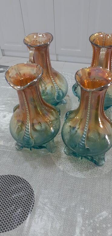 Məhsul: İrideks örtüklü dekorativ şüşə qablar dəsti. SSRİ dönəmindən qalıb! Hamısı birlikdə 20 manat! Təsvir: - 4 ədəd şüşə qab: 2 ədəd qulplu sürahi/formalı qab və 2 ədəd vaza. - Material: qalın,...
