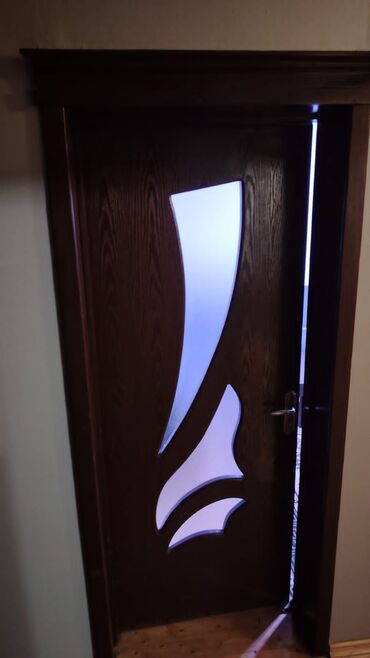 Məişət və ofis üçün interyer qapıları - Material: tünd qəhvəyi rəngli MDF/laminat üzlüklü taxta konstruksiya - Dizayn: dalğavari xəttlə kəsilmiş şüşə yerləşdirmələri; həm üst hissədə kiçik pəncərə...