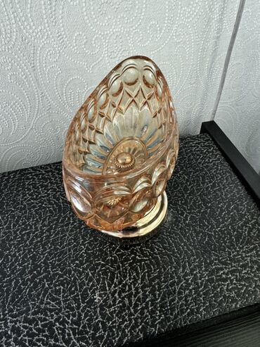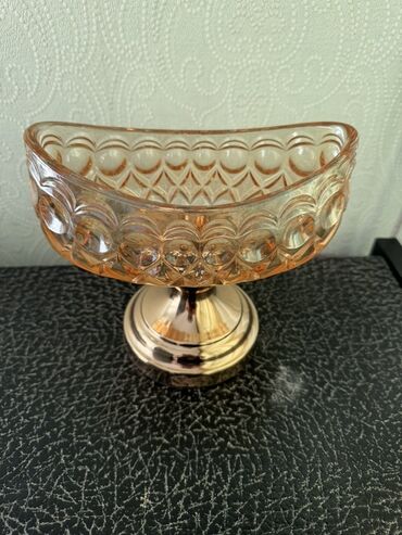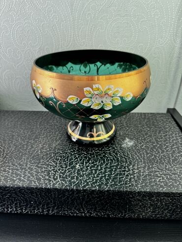 - Ayaqlı iri meyvə/salamka qabı: Dərin yaşıl şüşə, üzərində qızılı örtük və əl işi relyef çiçək naxışları. Dairəvi kasa forması, stabil ayaqlıq, kənarlarda qızılı dekor xətləri.