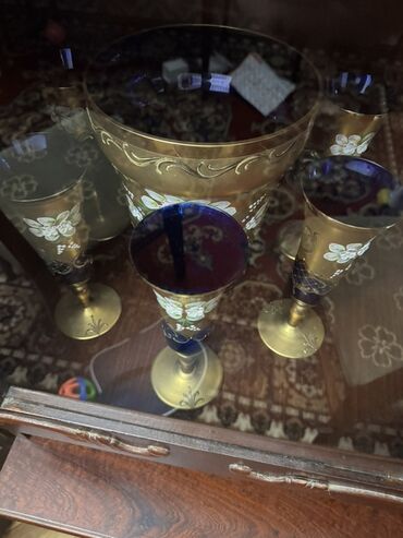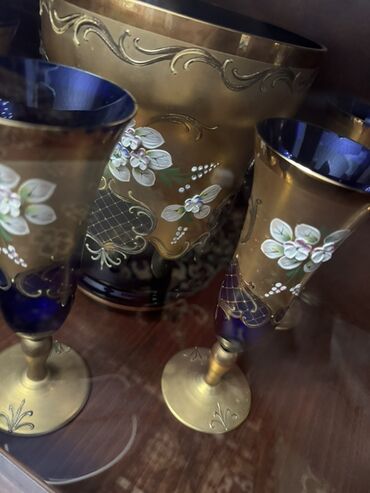 Bohemiya üslublu əl işi bəzəkli şüşə kolleksiyası - Material: qalın keyfiyyətli rəngli şüşə (kobalt-mavi və yaşıl tonlar), 24K qızılı naxışlama və emal çiçək aplikasiyaları - Üslub: klassik Bohemi...