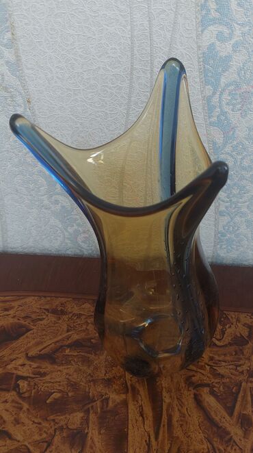 QEDIMI GULDAN. Yüksək keyfiyyətli şüşədən hazırlanmış, qəhvəyi və göy rənglərin ahəngdar kombinasiyasına malik dekorativ vaza. Unikal dizaynı, əyri ağzı və qabarıq səthi sayəsində bu vaza hər bir interyerə zəriflik qatacaq. Minimalist və ya müasir evlər üçün ideal seçimdir, həm təzə güllər üçün, həm də sadəcə bəzək əşyası kimi istifadə edilə bilər. Qabarıq quruluşu sayəsində ələ rahat oturur və dayanıqlı quruluşu ilə uzunmüddətli istifadə üçün uyğundur. Evinizə və ya ofisinizə zərif bir görünüş qatmaq üçün əla bir əşyadır.