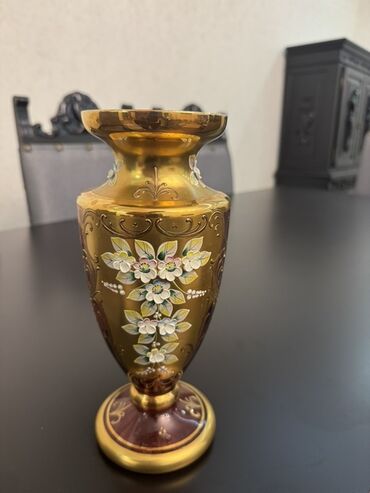 Bəzəkli şüşə vaza - Material: qalın yaşıl şüşə, parlaq qızılı rəngli örtüklə kombinasiya - Dizayn: əl işinə bənzər zərif floral naxışlar və qızılı ornamentlər; romb şəbəkəli fon; ağ-çəhrayı çiçək ...