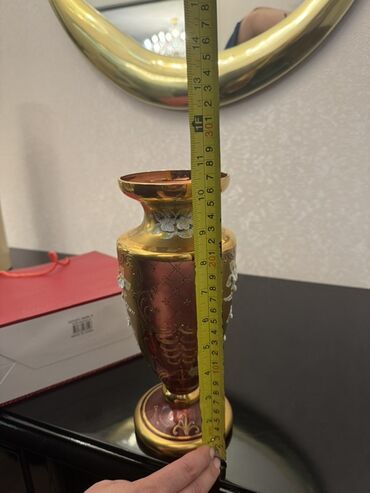 Qızılı dekorlu qırmızı şüşə vaza - Material: qalın rəngli şüşə - Rəng: dərin qırmızı, parlaq qızılı akssentlər - Üst və alt hissə: qızılı örtük və zərif naxışlar - Korpus: qırmızı şəffaf şüşə, ova...