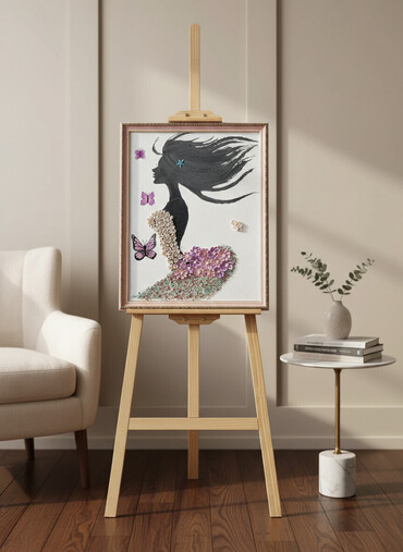 - Texnika: Qarışıq materiallar (teksturalı akril boya, dəniz balıqqulaqları, dekorativ daşlar və 3D çiçək elementləri)