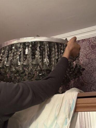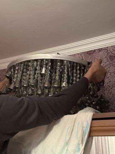 Şüşə-kristal tavan lampası (plasfon) - Forma: dairəvi, yarı-qapalı tavan tipli - Material: parlaq xrom rəngli korpus, kəsimli kristal elementlər və şüşə bəzəklər - Dizayn: ağ fon üzərində qızılı ç...