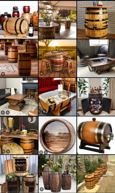 - Dekorativ masalar və stollar: bütöv və ya yarım çəllək bazasında, üstü taxta və ya şüşə variantlarla.