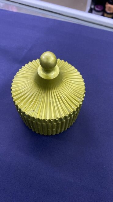 - Material: dekorativ qabda tökülmüş ətirli şam (metallic-yaşıl rəngli, relyefli qapaqlı qab)
