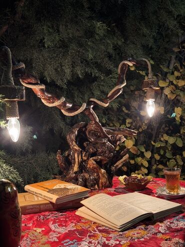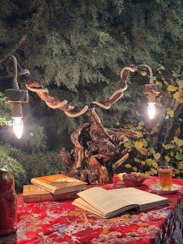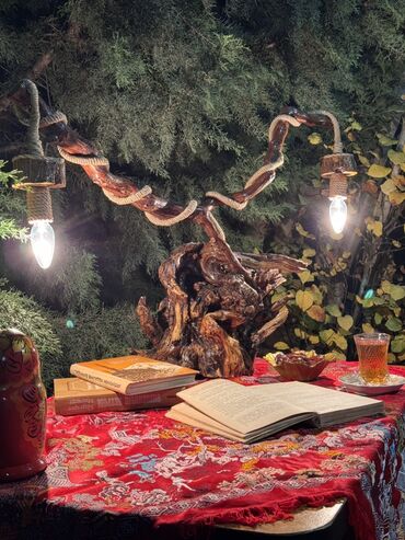 - Dizayn: Qədim ağac kökündən formalaşdırılmış bədii baza, yuxarı hissədə təbii, qıvrım budaq; budağın üzərində kəndir sarınmış iki asma patron.