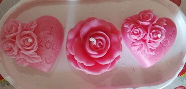 Məhsul: əl işı şam kompozisiyaları Təsvir: - Orijinal dizaynlı dekorativ şamlar: kitab dəstinə bənzər bənövşəyi rellefli şam, qızılgül naxışları və ornamentlərlə. - Çəhrayı qızılgül formasında det...