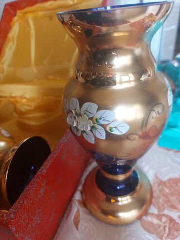Boyalı büllur dekor dəsti - Material: qalın rəngli büllur/şüşə, üzəri əl işi qızılı boyalar və relyef 3D çiçək naxışları ilə bəzədilib. - Rənglər: kobalt göy, zümrüd yaşıl və qızılı tonların kombi...