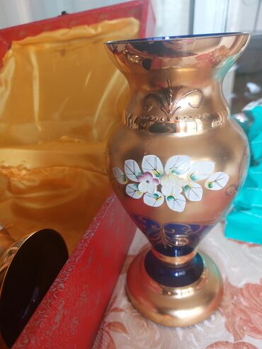Lüks bəzək üçün şüşə dekor dəsti - Material: yüksək keyfiyyətli rəngli şüşə, üzərində zəngin qızılı örtük və əl işi relyef 3D çiçək naxışları - Rəng palitrası: qızılı fon, tünd kobalt mavi və bord...