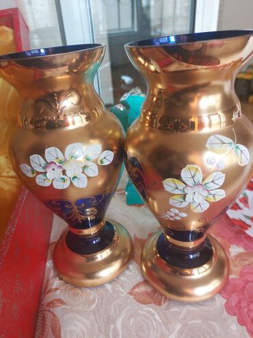 Bohemia şüşəsindən dekorativ vaza dəsti (2 ədəd) - Material: Bohemia şüşəsi - Üslub: Qızılı rəngli örtük və əl işçiliyi dekor – relyefli naxışlar, üçölçülü çiçək kompozisiyaları, incə mirvarı nöqt...