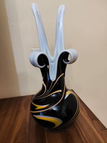 - 2-ci vaza: Bədii şüşə dizayn. Qara gövdə üzərində ağ, sarı və qızılı tonlarda spiral naxışlar. Üst hissə iki qollu, dalğavari və bükümlü formadadır, ağ şüşə vurğularla tamamlanıb. Dəyirmi altlıq stabil quruluş yaradır.
