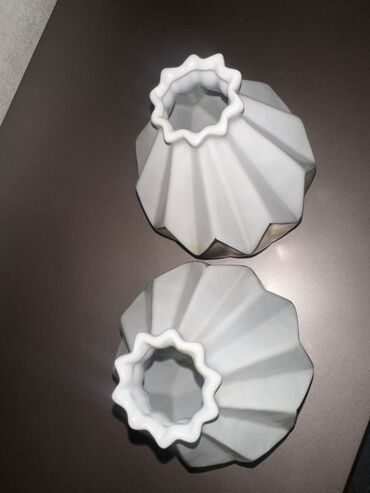 Müasir dekorativ keramik vazalar dəsti - Material: mat ağ keramika - Dizayn: minimal və heykəltəraş üslubunda formalar - Halqa formalı kiçik vaza - Üç mərtəbəli, yumru konturlu vaza - İki ay...