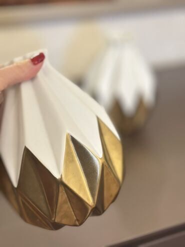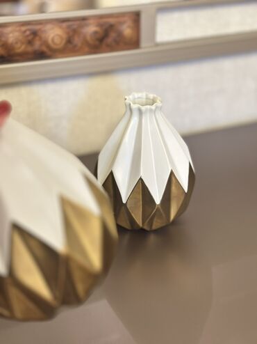 Müasir dizaynlı dekorativ vaza - Rəng: ağ - Forma: çoxbucaqlı/qatlı siluet, dar boğazlı, konusvari gövdə - Material: keramika effekti verən, hamar səthli möhkəm kompozit - Üst hissədə qızılı naxış...