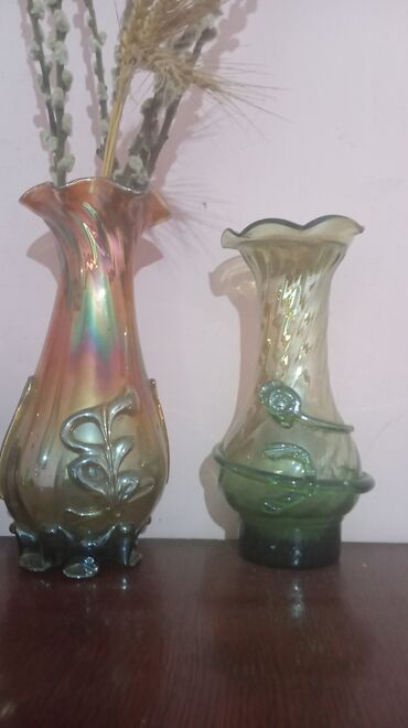 - İridisssent şüşə vazalar: biri hündür, biri nisbətən alçaq və enli boğazlı.