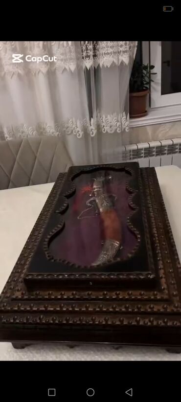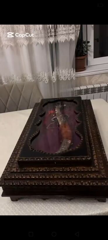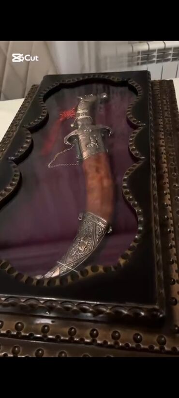 - Ənənəvi Qafqaz üslubunda dekorativ xəncər: metal hissələrdə zərif oyma naxışlar və relyef fiqurlar, tutacaq və qın hissəsində detallı işləmə.