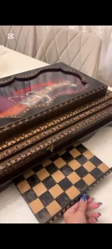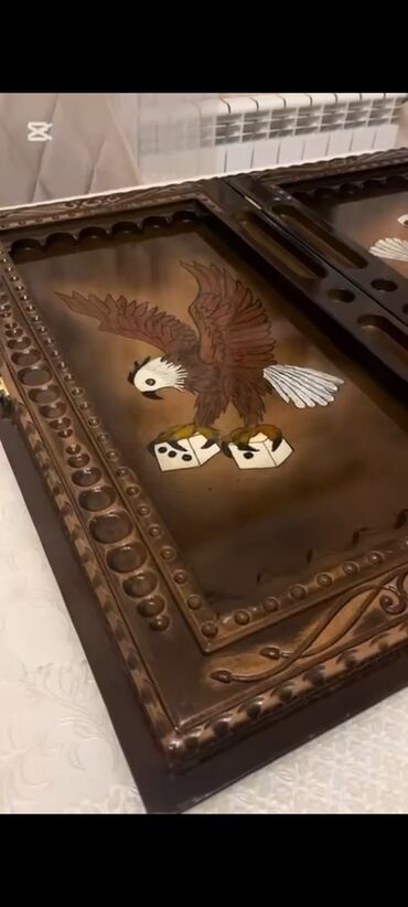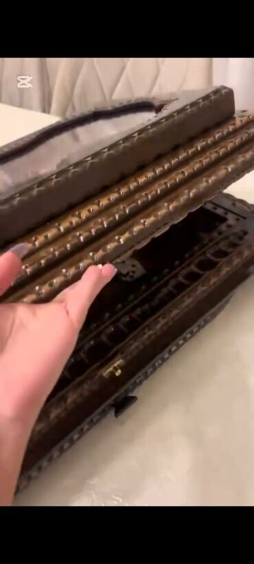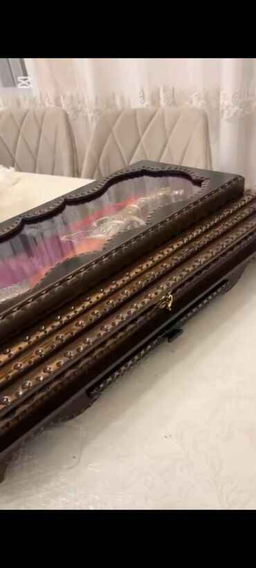 - Vitrin qutu: sərt ağacdan hazırlanmış, çoxsəviyyəli haşiyə, mismarvari dekorativ başlıqlar və əl işləməsi naxışlı çərçivə.