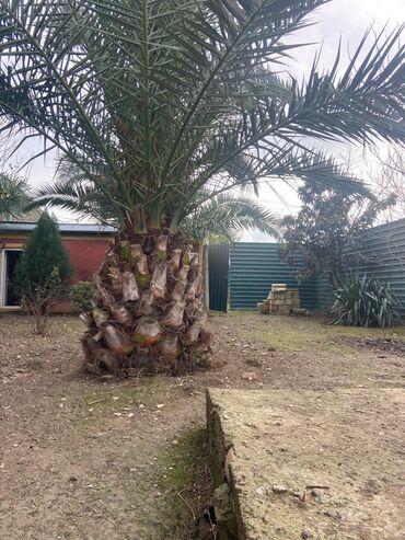 Satılır: Meyvəli xurma palmisi (Phoenix dactylifera) - Həyətdə böyüdülmüş, güclü gövdəli, sağlam və dekorativ xurma palmisi - Hündürlüyü təxminən 5–6 m, tacı geniş, sıx yarpaqlıdır - Ağac artıq mə...