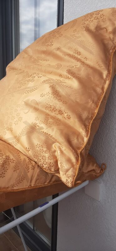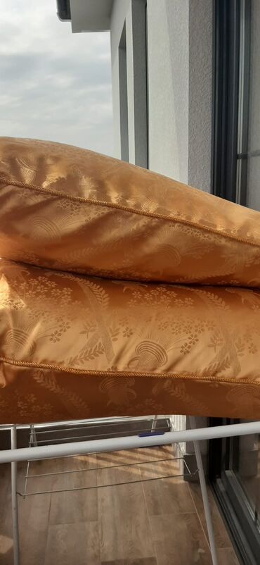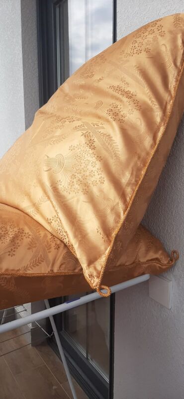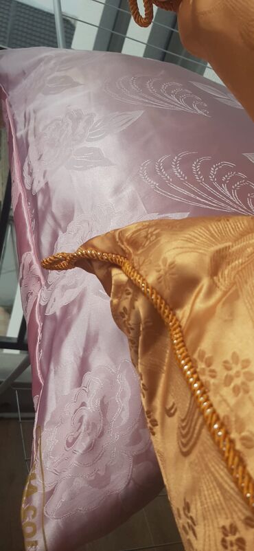 Dəstdə şəkillərdə göstərilən böyük ölçülü qızılı yastıqlar və eyni üslubda çəhrayı atlas üzlüklər mövcuddur. Zərif naxışları və dekorativ kənar tikişi ilə klassik-interyerlərə uyğun, diqqətçəkən aksessuardır.