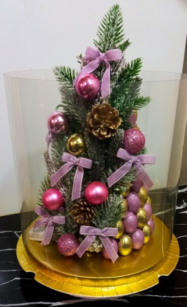 - Bəzəklər: məxməri çəhrayı lent bantlar, çəhrayı və qızılı şar oyuncaqlar, qızılı rəngə boyanmış şam qozaları, parıltılı topçular.