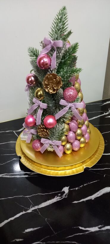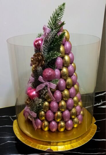 - Konus formalı kompozisiya: bir tərəfi iynəyarpaq budaqları ilə işlənib, digər tərəfi isə tamamilə şokolad konfetləri ilə (çəhrayı və qızılı folqa) sıx şəkildə düzülüb.