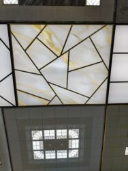 - İşıqötürücü panel quruluşu: metal karkaslı kvadrat və ya çoxbucaqlı bölmələr, arxa LED işıqlandırma ilə bərabər yayılma.