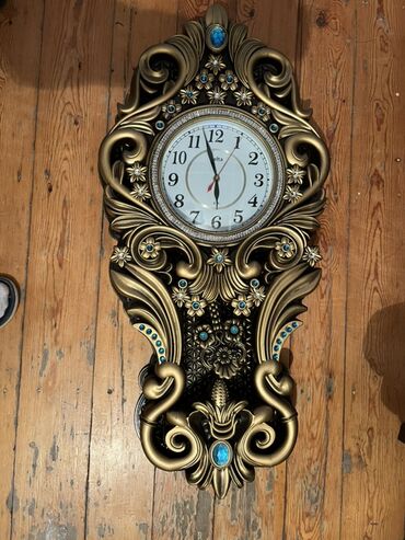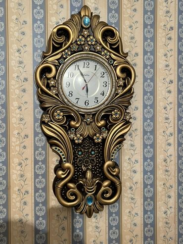Dekorativ divar saatı – klassik barok üslubunda - Material: metal/bronz rəngli korpus, oyma naxışlı floristik ornamentlər - Üst hissədə qab formalı dekor, aşağıda asma elementlər - Saat siferblatı...